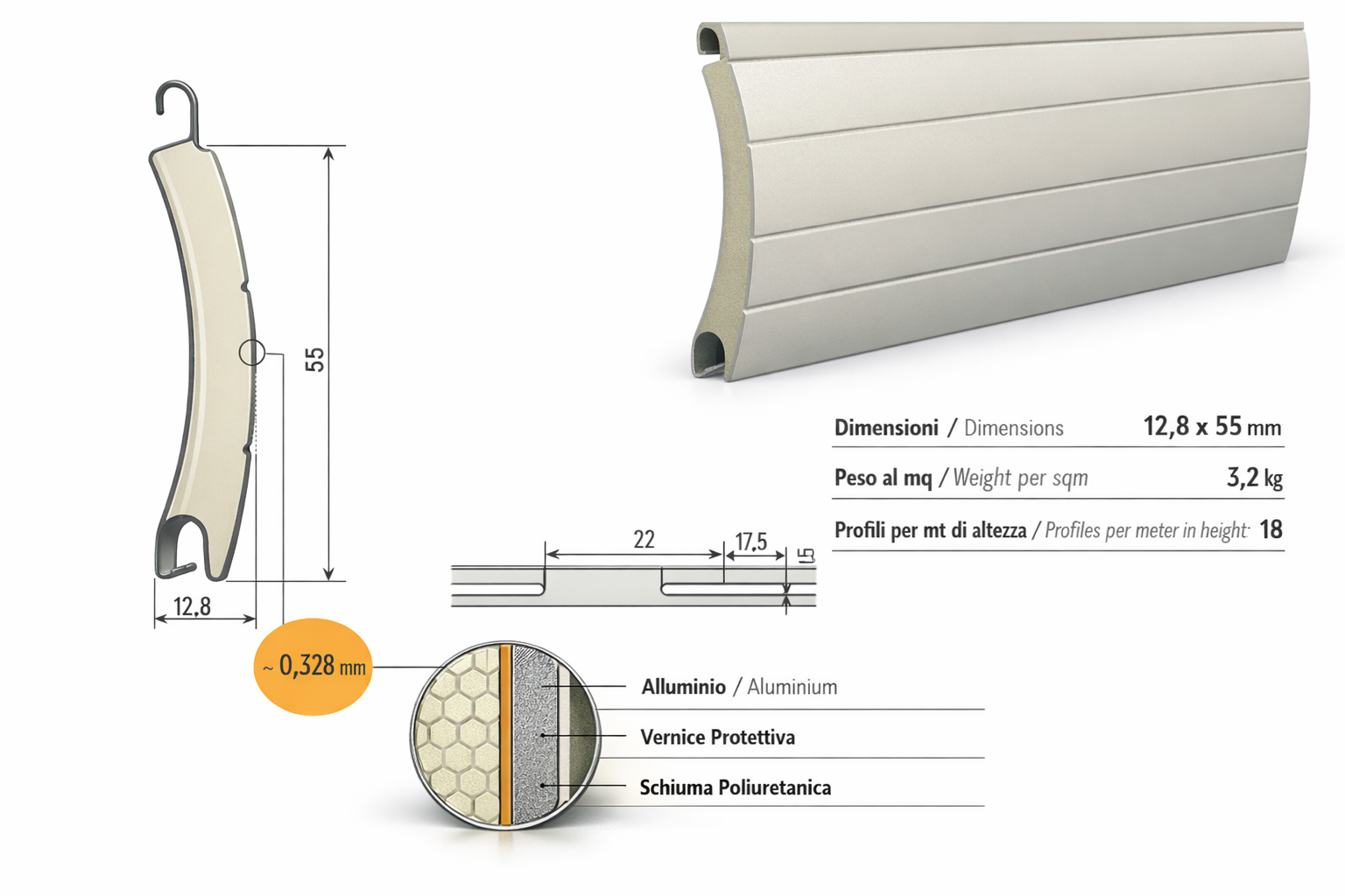 Lamella coibentata in alluminio: profilo curvo con schiuma poliuretanica per migliorare isolamento termico e acustico. Meno peso, migliori prestazioni, con finitura resistente ai raggi UV e agli agenti atmosferici per durare nel tempo.